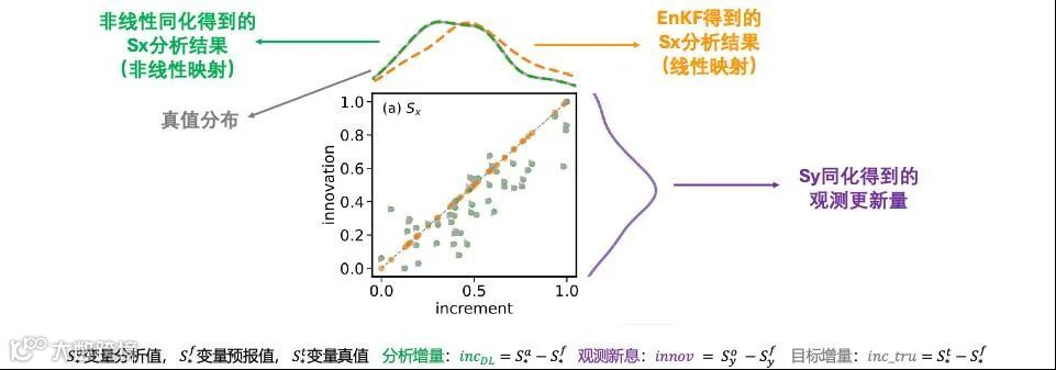 研究表明:这一性能差异源于两类同化框架对变量间物理关系的刻画能力不同。传统EnKF同化框架主要基于变量关系的线性假设,导致在处理非线性同化问题时,该类方法难以实现观测信息在变量间的正确传递。相比之下,数据驱动的DL新同化方法能够较为准确地刻画物理量间随时间变化的非线性关系,进而实现了观测更新量(高斯分布)向先验预报场的非线性投影,最终生成更符合实际的非高斯分析场,有效提升了对极端事件的同化能力。