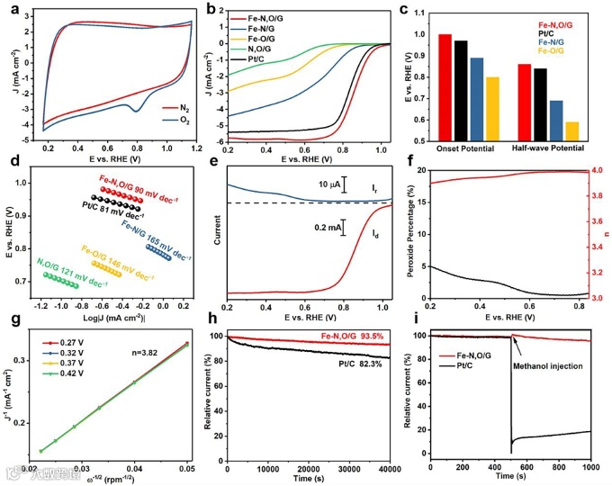 图 3. Fe-N,O/G的电化学ORR性能。 (a) 在 O2 和 N2 饱和的 0.1 M KOH 中,Fe-N,O/G 在 50 mV s-1 下的 CV 测试。 (b) 在 O2 饱和的 0.1 M KOH 中,Fe-N,O/G, Fe-N/G, Fe-O/G, N,O/G 和 Pt/C 电催化剂的LSV曲线。 (c) Fe-N,O/G、Fe-N/G、Pt/C 和 Fe-O/G 的起始电位和半波电位比较。 (d) Fe-N,O/G、Fe-N/G、Fe-O/G、N,O/G 和 Pt/C 的 Tafel 图。 (e) 通过 RRDE 测量的 Fe-N,O/G 的环电流和圆盘电流。 (f) 基于 (e) 图计算的过氧化物百分比和电子转移数 (n)。 (g) Fe-N,O/G 的 K-L 图和n值。 (h) Fe-N,O/G 和 Pt/C 的稳定性曲线。 (i) Fe-N,O/G 和 Pt/C 的甲醇耐受性测试。