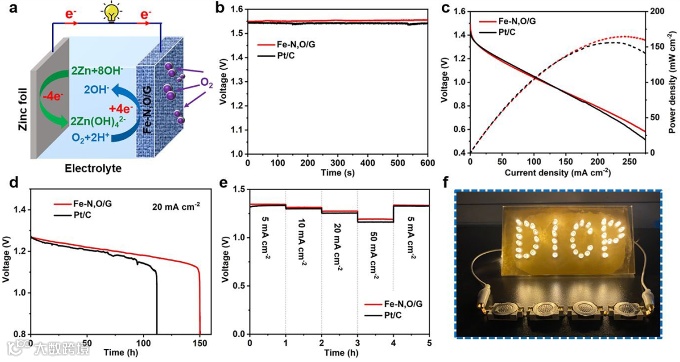 图 4. 基于Fe-N,O/G的锌空气电池的电化学性能。 (a) ZAB 示意图。 (b) 锌空气电池的 OCP 图。 (c) 基于 Fe-N,O/G 或 Pt/C 的水性 ZAB 的极化图和功率密度。 (d) 基于 Fe-N,O/G 和 Pt/C 催化剂的水性 ZABs 在 20 mA cm-2 下的长期放电曲线。 (e) 在 5 至 50 mA cm-2 的不同电流密度下,基于 Fe-N,O/G 的锌空气电池的放电图。 (f) 由串联固态 Fe-N,O/G 基锌空气电池供电的黄色 LED 照片。