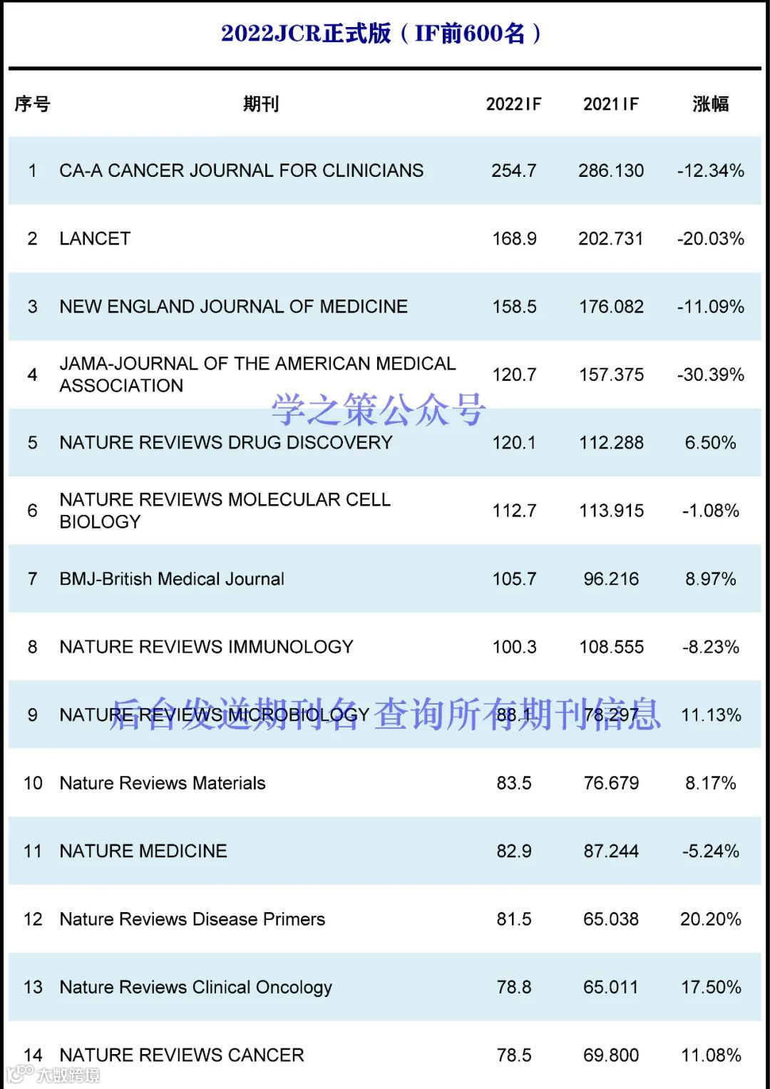 刚刚,科睿唯安发布2023年度《期刊引证报告》(Journal Citation Reports™,简称JCR™),后台回复“2022JCR”,下载最新IF表格!今年JCR的最大变化有两个:① ESCI和AHCI期刊首次获得影响因子。据最新数据显示,目前共有SCIE期刊9502本、ESCI期刊8214本、SSCI期刊3557本、AHCI期刊1834本。注:上述部分期刊可能由于收录年限不够而无法获得影响因子。② 自2023年起,影响因子只保留1位小数(此前为3位)。影响因子最高的仍然是Ca-A Cancer Journal for Clinicians,去年由508.702猛降至286.130,今年为254.7。国产期刊影响因子最高的仍然是Cell Research,最新IF为44.1。Nature、Science、Cell分别为:64.8、56.9、64.5。更多期刊情况,请参见下表,或于公众号后台回复“2022JCR”查询。