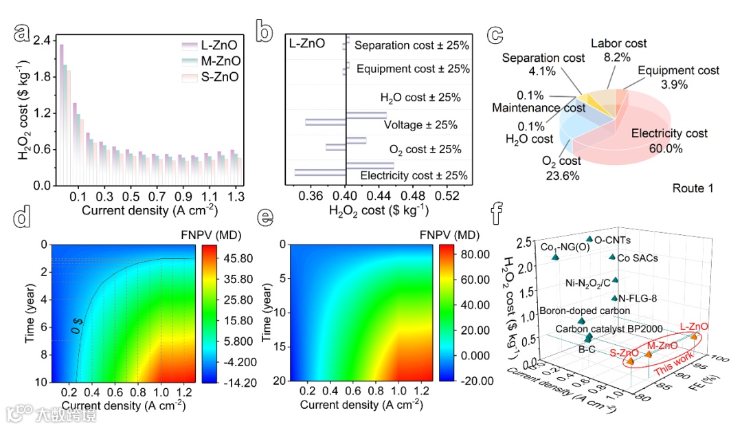 过氧化氢(H2O2)作为一种重要的化学品,在许多领域(如废水处理、工业漂白和化学氧化等)有广泛的应用。最近,二电子氧还原反应(ORR)作为一种新兴的H2O2合成技术受到关注,其具有原位制备、反应条件温和等优点。然而,传统ORR催化剂面临着活性和选择性之间制衡关系,很难满足工业化大规模生产需求。近日,南京理工大学陈胜教授课题组提出了一种反尺寸效应概念,助力安培级电流密度下高效产生H2O2。具体来说,研究了三种不同厚度的氧化锌催化剂,发现随着尺寸的增大,催化活性显著提升。其中,大尺寸的氧化锌(L-ZnO)纳米盘(厚度为87.7 nm)具有最优异的性能,在安培级电流密度下(>1 A cm-2)显示了~100%的H2O2选择性。通过DFT计算和原位拉曼光谱进行机理研究,发现了反尺寸效应的双重作用,不仅可以激活O2,同时还可以将d带中心向Femi能级移动来稳定关键反应中间体(*OOH)。在此基础上,进行了技术经济评估(TEA),其显示获得经济利润的阈值电流密度为0.2 A cm-2,且在1.0 A cm-2下具有最低H2O2生产成本(0.4 $ kg-1)。