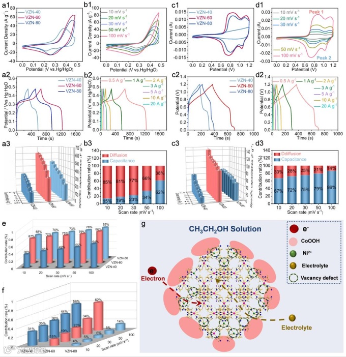 图3. 三电极系统测试性能:a1) 不同样品在50 mV s-1扫描速度下的CV曲线。a2) 不同样品在0.5 A g-1电流密度下的GCD曲线; a3) 不同样品在不同电流密度下的比电容对比图。VZN-60 的性能,包括 b1) CV曲线; b2) GCD 曲线和 b3) 电容贡献百分比; e) 不同样品的电容贡献。双电极系统测试性能:不同材料的 c1) CV 曲线 (50 mV s-1),c2) 不同材料的 GCD 曲线 (0.5 A g-1); c3) 不同材料在不同电流密度下的比电容对比图。 d1) VZN-60在不同扫描速度下的CV曲线; d2) VZN-60在不同电流密度下的GCD曲线; d3) VZN-60的电容贡献; f) 不同材料的电容贡献; g) 离子传输机理图。