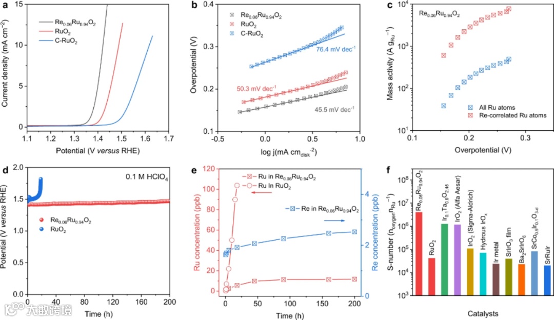 图 1. 酸性OER性能。在 O2 饱和的 0.1 M HClO4 中,Re0.06Ru0.94O2、RuO2 和商业 RuO2 的 a LSV 曲线和 b Tafel 图。 c 在Re0.06Ru0.94O2 中, Ru 原子的质量活性与过电势的关系。 d Re0.06Ru0.94O2和RuO2的恒流计时电位稳定性曲线。 e 在Re0.06Ru0.94O2和RuO2的稳定性测试中,溶解的 Ru 和 Re 离子浓度。 f 不同酸性 OER 催化剂的 S 值比较。