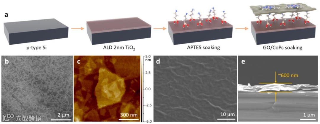 图2. (a) STA-GO/CoPc 组装过程示意图。原子颜色:红色、O;黄色,Si;灰色,C;白色,H;蓝色,N;粉红色,Co。STA 单层 GO/CoPc 的 (b-c) SEM 和 AFM 图像。STA-GO/CoPc 的 (d) 顶视图和 (e) 横截面 SEM图像。
