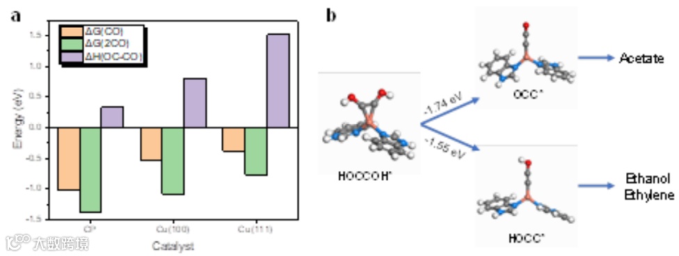 图4. (a)一个CO和两个CO在CP, Cu(100)和Cu(111)上的吸附能,以及CO二聚在CP, Cu(100)和Cu(111)上的焓变。(b)CP催化剂上乙酸和乙醇/乙烯分支反应的几何结构与自由能。