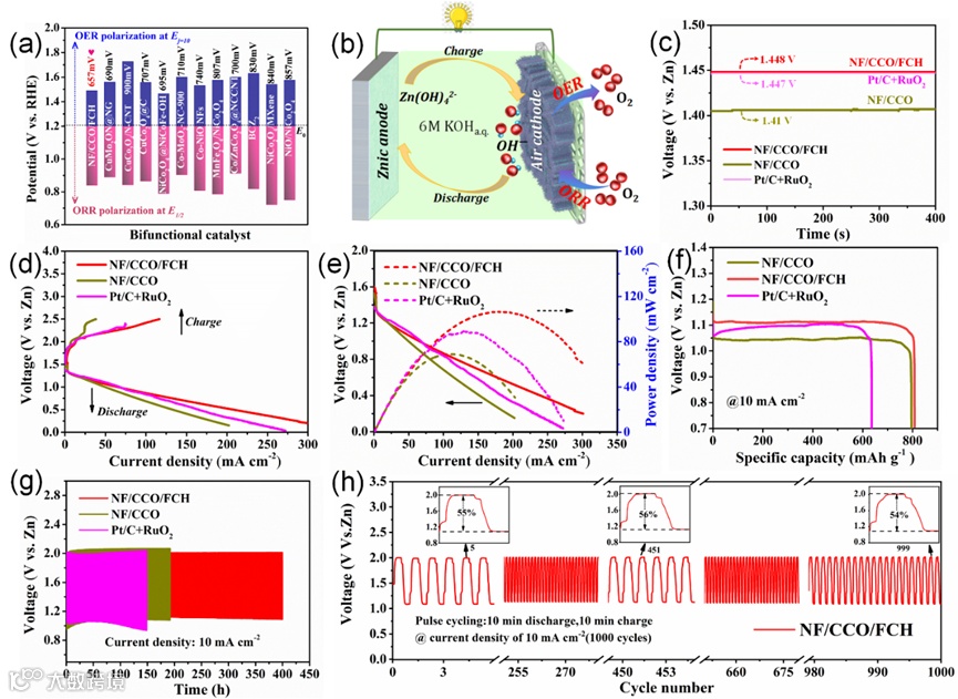 3. 自支撑的NF/CCO/FCH双功能氧正极有助于实现高效的可充锌-空气电池(能量密度为894.5 Wh kgZn–1,在10 mA cm–2下可稳定循环400 h/1000次)以及高性能的柔性全固态锌-空气电池。