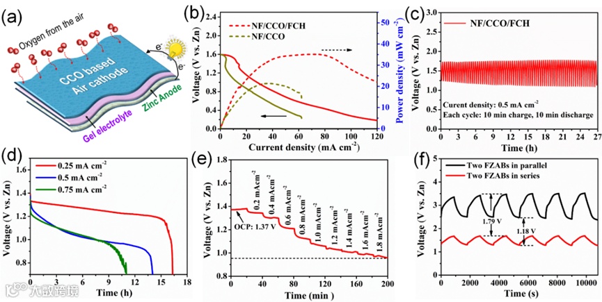 实验结果显示,基于NF/CCO/FCH空气阴极的可充电全固态柔性锌-空气电池可提供35.2 mW cm-2的功率密度,出色的循环寿命(在0.5 mA cm-2下为27 h)及其优异的机械柔韧性。