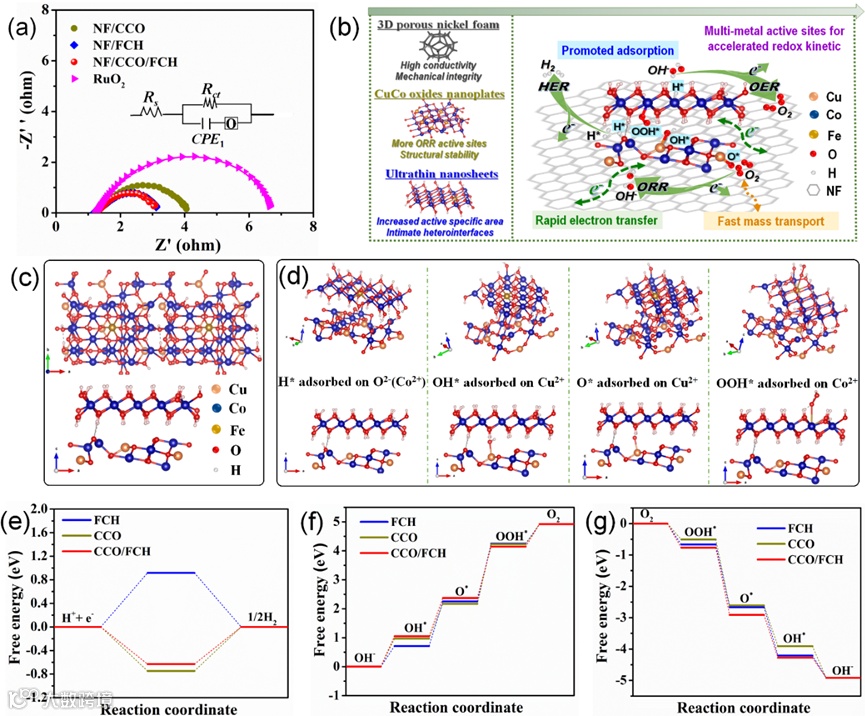 图4 (a)不同电极OER的阻抗图。(b) NF/CCO/FCH的催化途径示意图。(c) CCO/FCH的优化结构。(d) DFT优化的中间产物吸附在CCO/FCH中不同优势活性位点上的构型。HER (e)、OER (f)和ORR (g)过程中不同催化剂的自由能图。