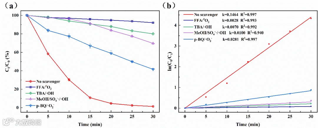 图8 进一步的淬灭实验证明了1O2 和·OH在污染物降解过程中的主导作用。