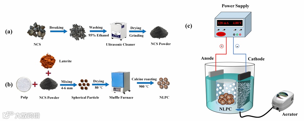 图1(a)NCS的预处理:将NCS破碎成直径≤15 mm的碎片后用95%的乙醇清洗,再经研磨后过35目筛(催化剂最牢固)使用;(b)NLPC的制备过程:将NCS和红土加水混合,再加入3.5% 质量分数的纸浆为造孔剂(高温烧蚀后留下孔隙),纸浆由废纸屑浸泡粉碎后使用,制备成4-6 mm的圆球颗粒,在马弗炉中经室内温度煅烧至400 ℃停留一小时,再煅烧至900 ℃停留一小时,冷却后得到NLPC。(c)反应器示意图:阴极是石墨毡,阳极是DSA电极,催化剂盛在多孔塑料笼中便于回收。