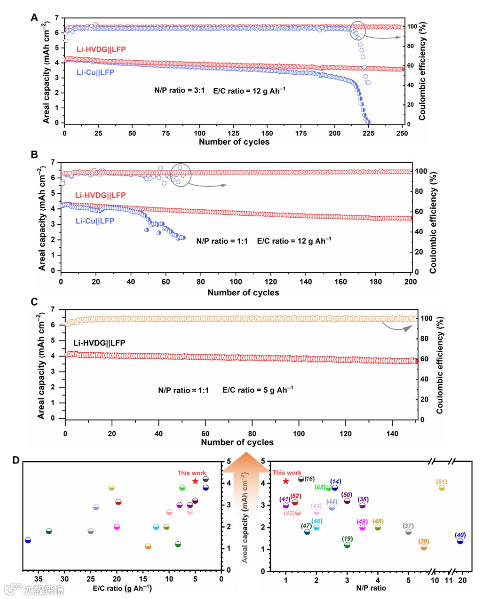 图6 超支化缺陷石墨烯阵列作为锂负极载体材料的全电池性能表征。