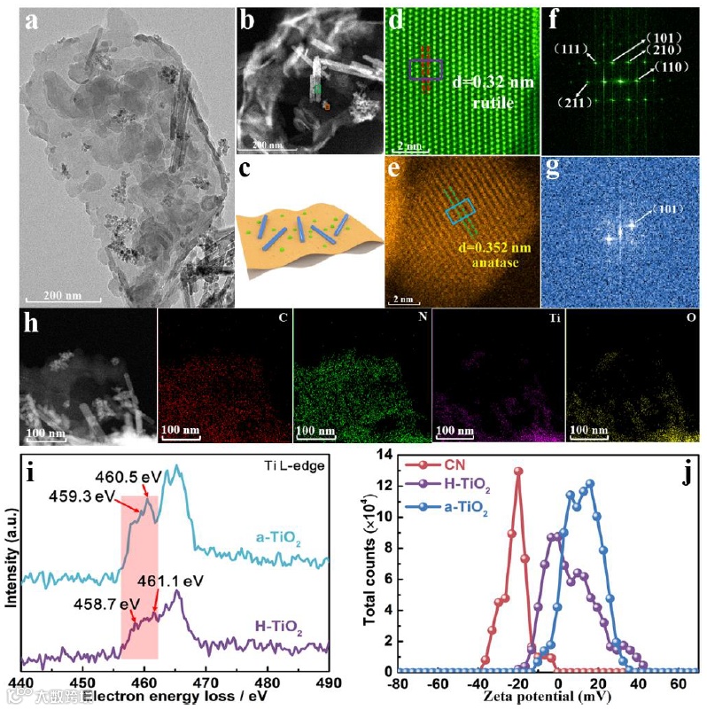 图2. a) TSP异质结的TEM图像。b) TSP 异质结的 HAADF-STEM 图像。c) 由C3N4 纳米片(橙色)、金红石 TiO2 纳米棒(蓝色)和锐钛矿 TiO2 纳米颗粒(绿色)组成的 TSP 异质结示意图。d) 和 e) 分别为绿色和棕色方框的放大图像。f, g) 分别取自相应的绿色方框(金红石纳米棒)和棕色方框(锐钛矿纳米颗粒)的FFT 图像。h)TSP 的 STEM 元素mapping图像。i)绿色区域的 H-TiO2 和棕色区域的锐钛矿 TiO2的 EELS 光谱。j) 纯 CN、H-TiO2 和 a-TiO2 的 Zeta 电位。
