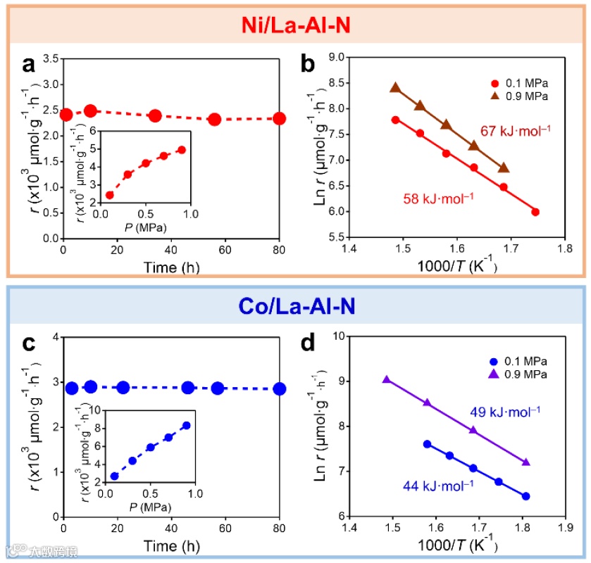 图2. Ni/La-N-Al的 (a) 催化活性和 (b) Arrhenius图。Co/La-N-Al的数据见 (c) 和 (d)。(a) 和 (c) 的插图表示每种催化剂的高压效应。