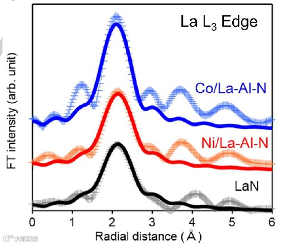 图6. LaN以及Ni和Co负载La-Al-N的EXAFS光谱。交叉点和实线代表实验数据点和理论拟合。