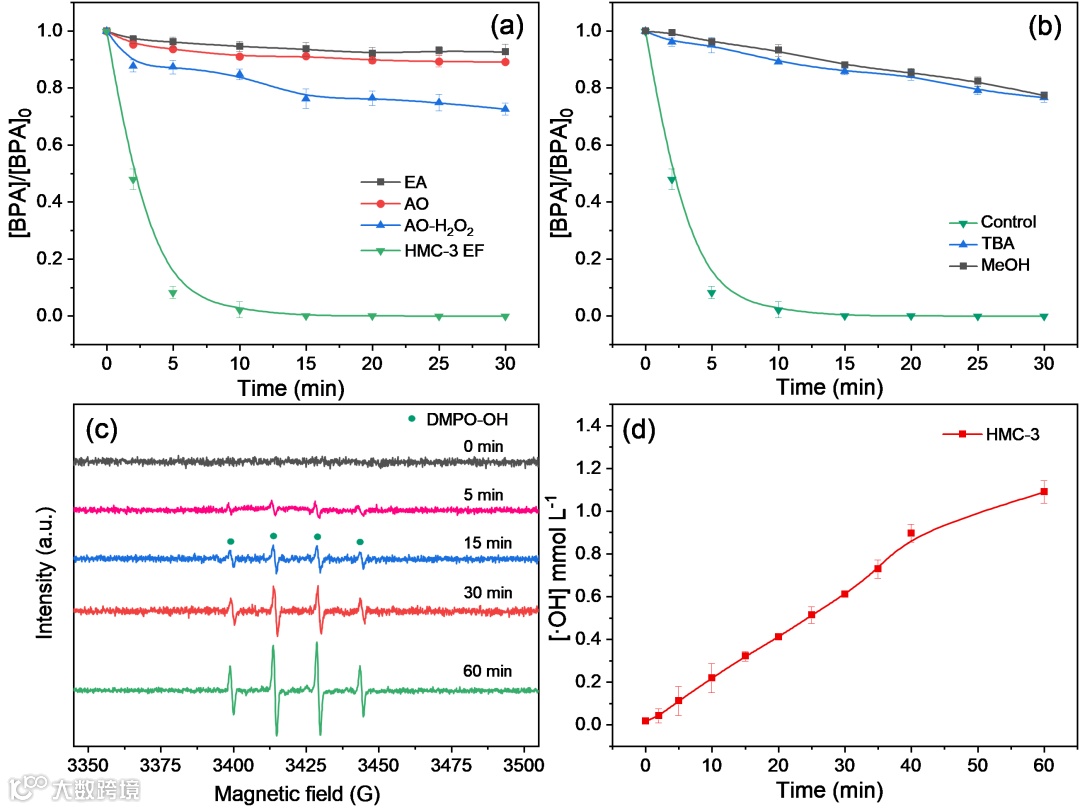 降解机理分析结果显示,HMC-3电芬顿体系对BPA的降解过程由·OH引起的自由基氧化过程主导。值得注意的是,经水杨酸氧化法测定,60 min内体系中·OH的累积量为1.09 mM;考虑到−0.7 V电位下60 min内生成的H2O2浓度为1.33 mM (图3),本研究中HMC-3电芬顿体系的H2O2活化率(利用效率)达到了82%。这一结果是已知文献中报道的最高值,也从侧面表明了该体系具有良好的Fe2+再生效率。