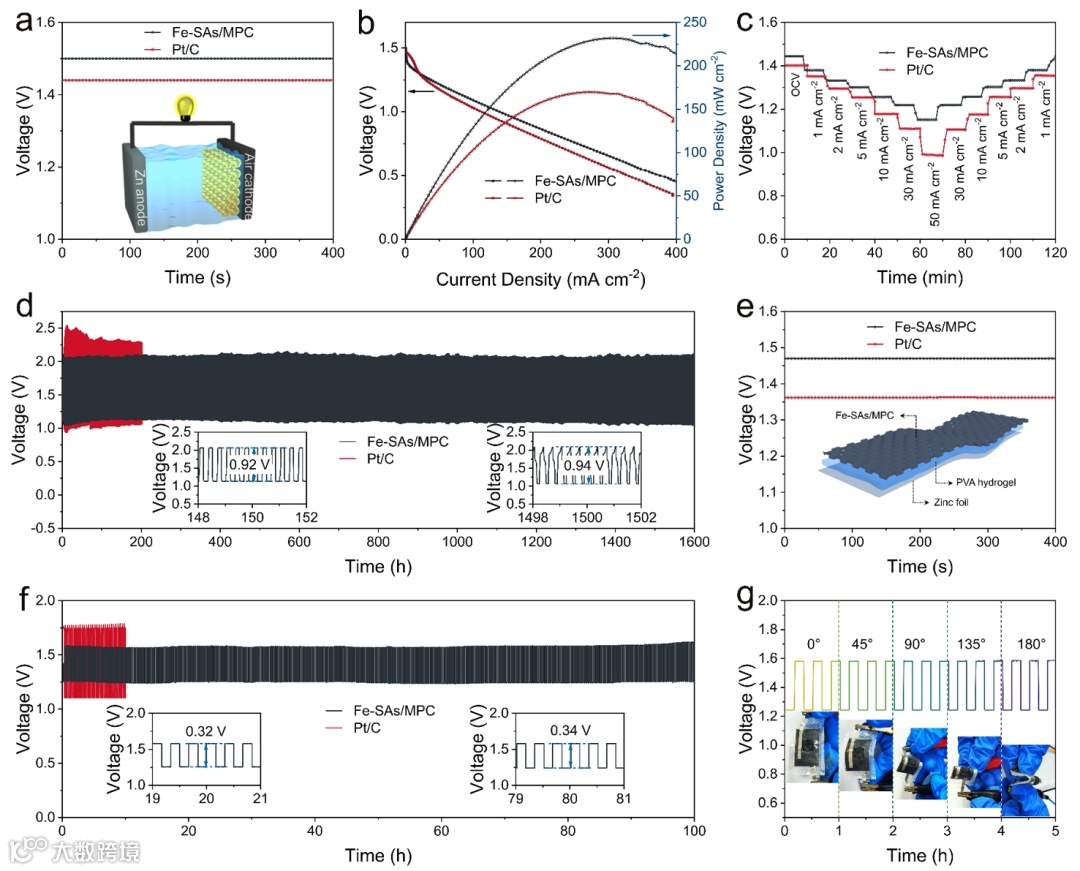 图5. Fe-SAs/MPC装配的水系和准固态锌-空气电池性能