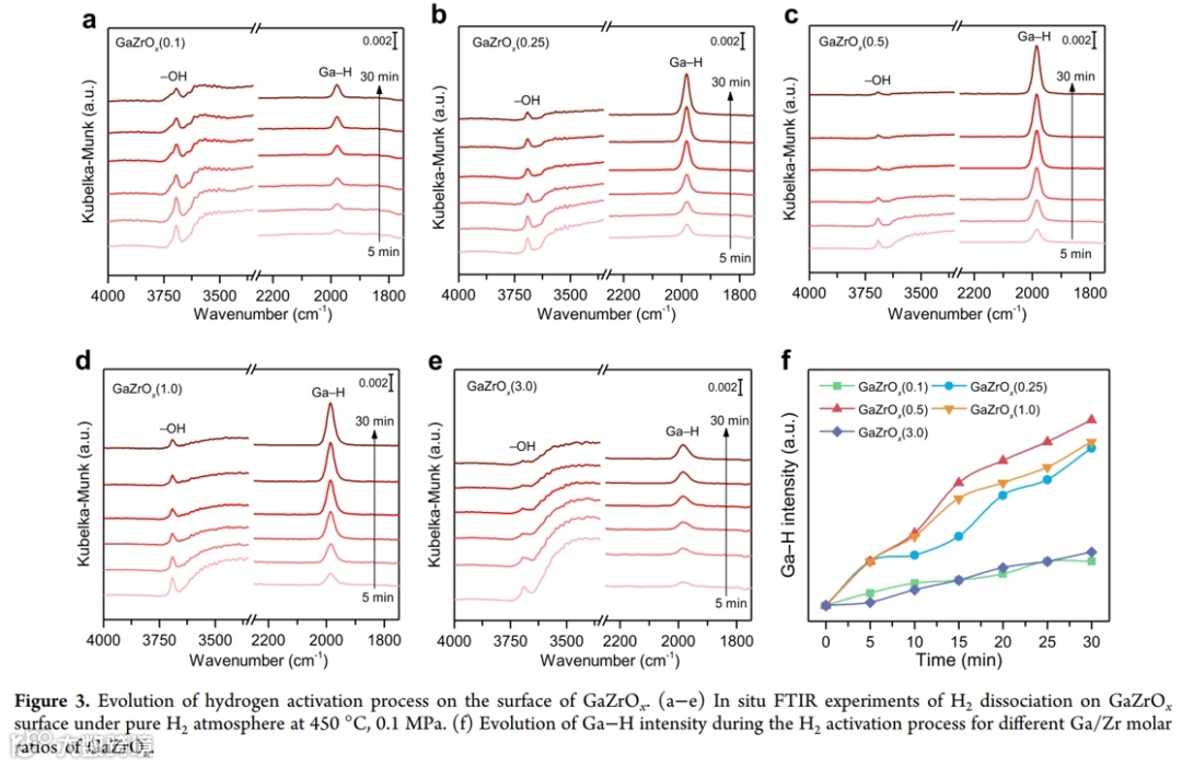 通过原位红外实验表明,在450 °C纯氢气气氛下,H2在GaZrOx表面解离生成–OH和Ga–H物种。随着Ga/Zr摩尔比值增加,Ga–H物种的强度呈现先增加后降低的趋势;Ga/Zr摩尔比值为0.5时,Ga–H键强度最高(图3a-f)。TKA-IR和TKA-MS对H2解离活化进行表征,结果显示氧化物表面的Ga–D比–OD消耗更多的H2,消耗H2的摩尔比值为21.9,大于异裂解离时的1.0,所以H2解离的过程主要为均裂解离。