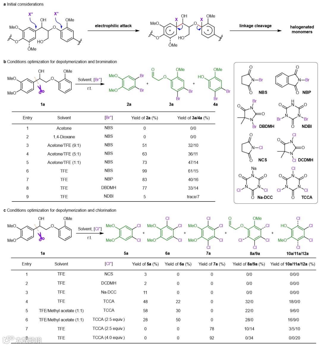 1. 以常用的商业化试剂N-溴代丁二酰亚胺(NBS)和三氯异氰脲酸(TCCA)为溴化和氯化试剂,利用卤正离子对木质素芳基环发生选择性亲电加成,进一步发生木质素C(sp2)–C(sp3)键的高效断裂,解聚的同时生成卤化芳基分子。