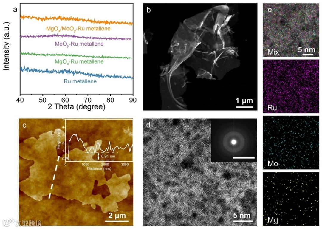 图1. MgOx/MoOy-Ru非晶金属烯的微观形貌与结构表征。