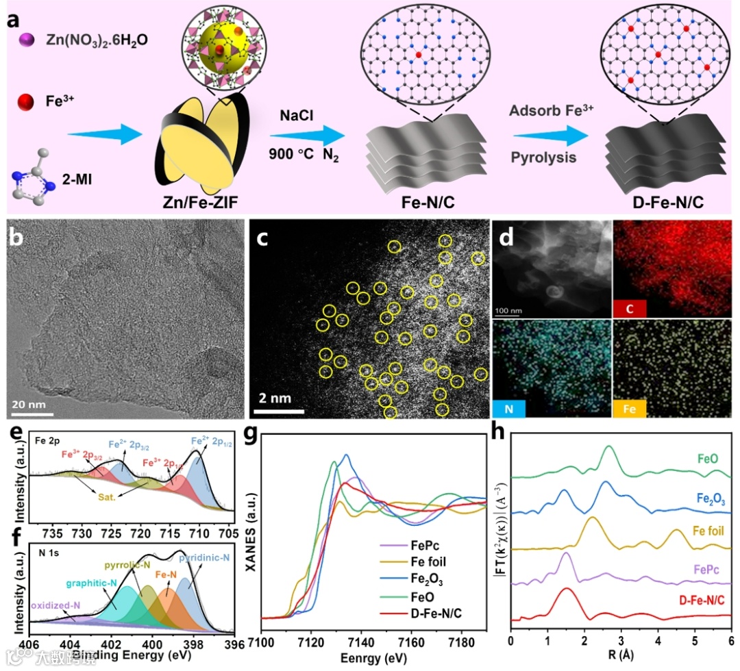 本工作通过盐模板辅助热解策略制备出了高比表面积且全开放片状结构的前驱体材料(Fe-N/C),然后吸附金属盐,通过两步热解策略得到高负载的铁基单原子催化剂(D-Fe-N/C)。扫描电镜(SEM)、透射电镜(TEM)和球差电镜(AC-HAADF-STEM)显示,D-Fe-N/C呈现出片状结构,并负载了高密度的Fe单原子。X射线光电子能谱(XPS)显示,D-Fe-N/C中存在较多的Fe-N和吡啶氮,且不存在属于金属铁颗粒的Fe0峰。同步辐射X射线吸收谱(XAFS)证明,D-Fe-N/C中的Fe元素是以单原子的形式存在。