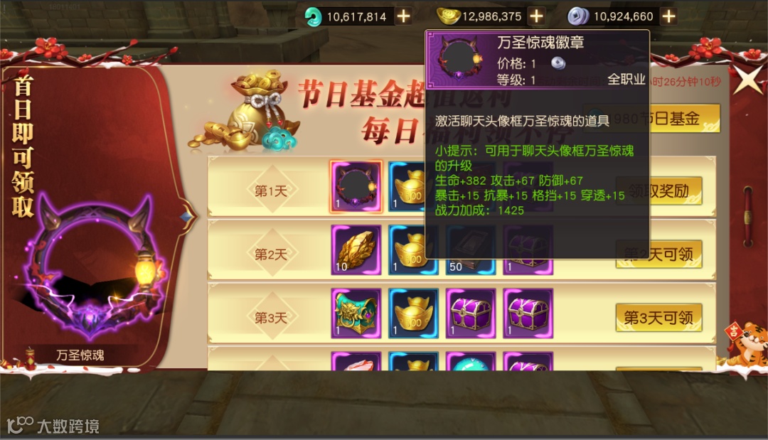 活动说明:在活动期间购买节日基金,每天可领取大礼包一份,7天返利总价值高达10倍,头像框-万圣惊魂、大量元宝、高级稀有材料、炼气、炼魄精华、禁锢宝箱等道具任你领,助力您战力飙升!