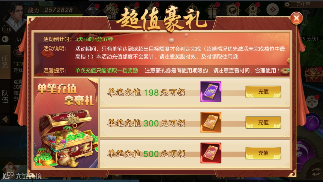 活动说明:活动期间每累积充值满指定额度,可获得大额充值礼包一份。充值越多奖励越丰厚,多充多得!