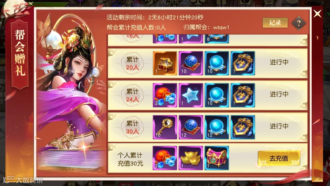 活动说明:活动期间将开启活动-帮会赠礼!帮会内充值达标人数达到对应档位可领取烽火令、战宠升级丹等大量奖励。