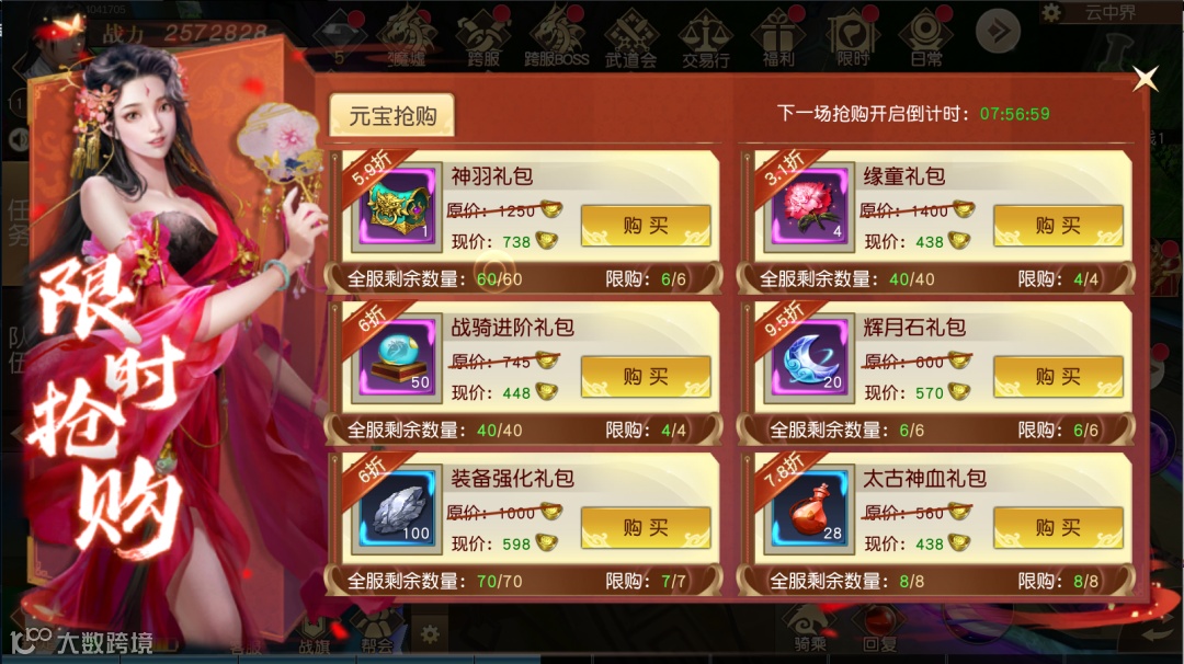 活动说明:活动期间,可通过元宝抢购秒杀各类折扣礼包,玩家可以优惠价秒杀想要的礼包,开启期间每日12:00和18:00将刷新礼包。