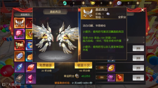 活动说明:玩家在活动界面通过消耗积分券砸蛋即可进行抽奖,新翅膀-晶韵凤羽等你来“砸”。