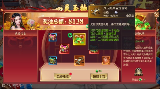 活动说明:活动期间玩家可以消耗灵玉兑换积分进行抽奖,抽奖有概率获得全新百分比暗器-噬魂卷镖、二代四星战宠-怒焰之灵、二代四星战宠-暗夜魅影等稀有大奖!抽奖次数越多获得大奖几率越高,且每次抽奖都会把5灵玉放到总奖池中,千万不要错过噢!