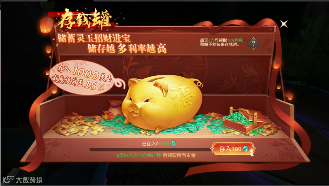 活动说明:活动期间玩家可以将灵玉存入存钱罐,活动首日存入3000灵玉,活动期间每天都可以领取450灵玉,活动期间最高共可以额外领取3150灵玉!存储的灵玉本金将随着最后一天的利息返还。返利天数有限,千万不要错过!