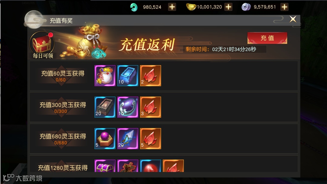 活动说明:(返灵玉)活动期间每累积充值满指定额度,可获得招财抽奖机会,抽奖可获得多倍灵玉返利,最高5倍返利,充值越多返还灵玉数越多,多充多得!