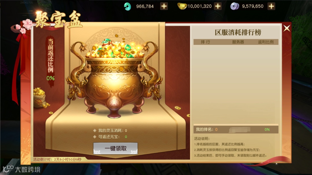 活动说明:(返元宝)活动期间将开启消耗灵玉返元宝活动-聚宝盆!海量元宝等你来拿!