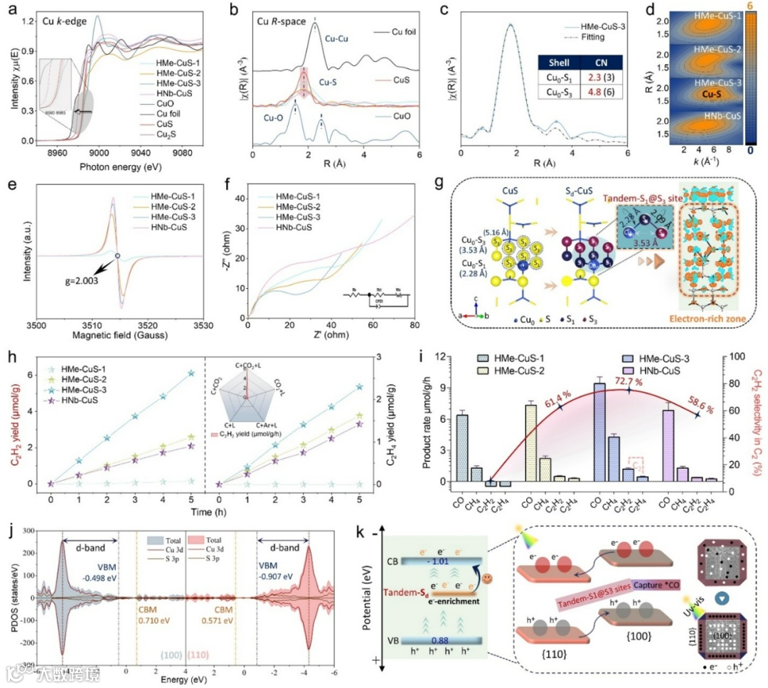 图3. 配位结构和性质的表征。HMe-CuS-1/2/3、HNb-CuS、CuO、Cu箔和Cu的Cu K边EXAFS的(a) XANES和(b) R空间谱。(c) HMe-CuS-3的EXAFS Cu K边拟合光谱。(d) HMe-CuS-1/2/3和HNb-CuS的Cu K边k3加权WT-EXAFS谱。HMe-CuS-1/2/3和HNb-CuS的(e) EPR谱和(f)电化学阻抗。(g) 多位点串联S缺陷位点的分子结构模型(Cu0-S1@S3)。(h)不同样品(HMe-CuS-1/2/3和HNb-CuS)的C2H2和C2H4产气量与紫外-可见光照射时间的关系;(i) 光催化CO2还原产气速率,误差条表示标准差。(j)(100)和(110)晶面的PDOS。(k) 晶面工程协同Cu0-S1@S3增强光催化C-C偶联生成C2的机理示意图。