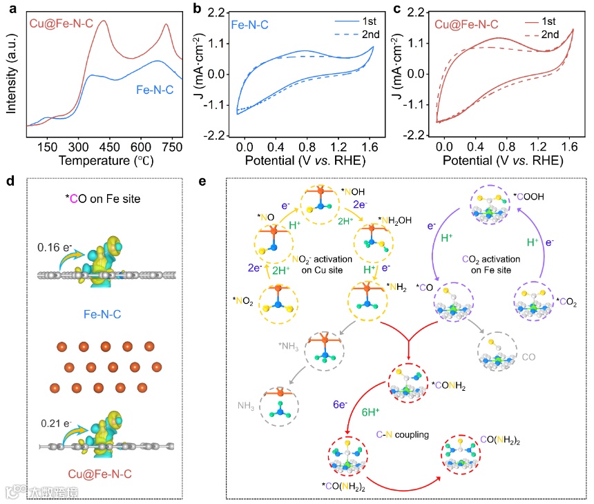 图4:(a)Cu@Fe-N-C和Fe-N-C的CO-TPD;(b)Fe-N-C 和(c)Cu@Fe-N-C在0.1 M KHCO3溶液中以50 mV s-1的扫描速率记录的CO剥离曲线;(d) Fe-N-C和Cu@Fe-N-C上吸附*CO的差分电荷图;(e) Cu@Fe-N-C上以CO2和NO2-为底物的尿素合成机理。
