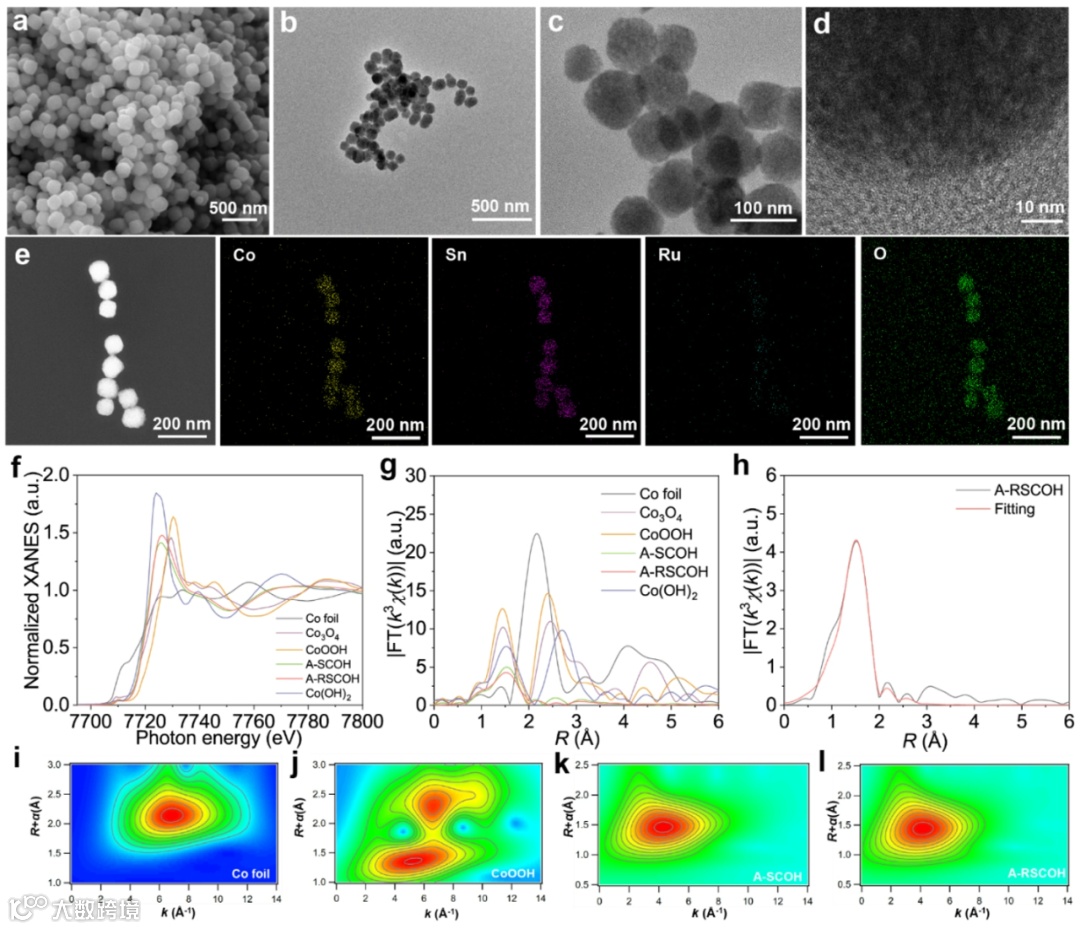 本文通过“共沉淀-离子交换热解两步法”制备了非晶态氢氧化物(A-RSCOH)析氧电催化剂。SEM和TEM表明其为纳米立方盒形貌,Co、Ru、Sn和O元素均匀分散。XANES表明Co的平均价态为+2左右,Ru的掺入使其Co的吸收边正移。通过分析XANES的边前峰和EXAFS,可知A-RSCOH的局域配位结构与Co(OH)2类似,Co第一壳层的配位数为5左右(如图1所示)。