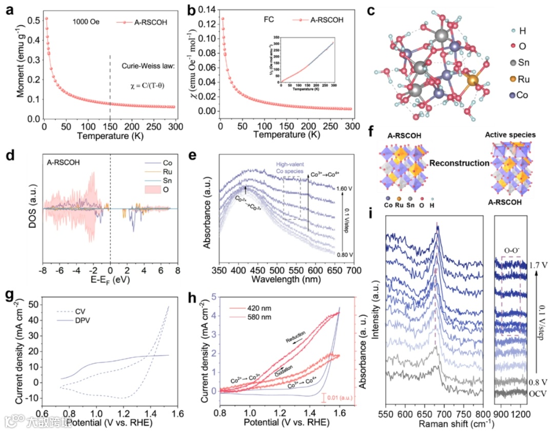 从温度依赖的磁化曲线可知(图2a,b),在引入Ru后,引发了Co和Ru之间的自旋量子相互作用,A-RSCOH的有效磁矩明显上升。根据材料表征搭建模型计算磁矩,与实验结果一致,A-RSCOH具备更高自旋密度的位点,且其费米能级附近的态密度上升,表明其具有良好电荷转移能力(图2c,d)。通过原位紫外光谱和原位拉曼光谱(图2e,h和i)追踪了A-RSCOH在施加电位后的重构过程,结合CV和DPV曲线可知Ru的引入加速了重构过程,产生了具有超氧键的高价态活性物种。