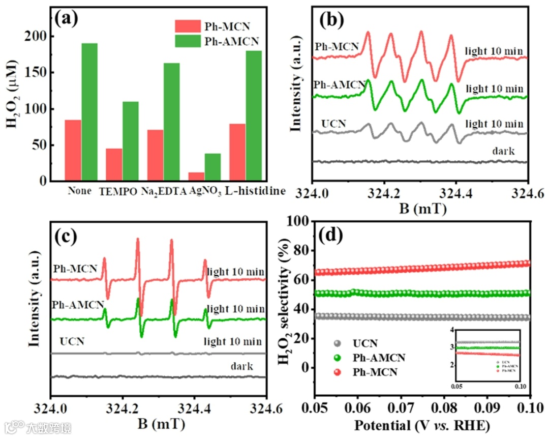 氮化碳分子中富含丰富的2e- ORR反应活性位点--七嗪单元,通过选取合适的单体分子,将电子供体苯环引入到氮化碳的分子结构中,构筑分子内的D-A结构,引导光生电子和空穴发生定向迁移,同时发生2e- ORR和2e- WOR,从而在纯水中高效生产H2O2。同时,煅烧的气氛以及温度可以有效调控供体与受体的比例,进一步影响H2O2的生产速率。