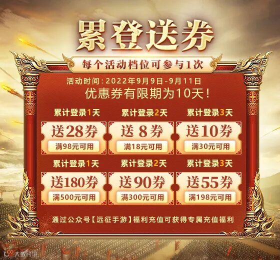 4、充值优惠券将在达成档次的第二天直接发送到角色上,在公众号充值或者游戏内点击充值可直接使用充值优惠券!充值优惠券有效期为15天。