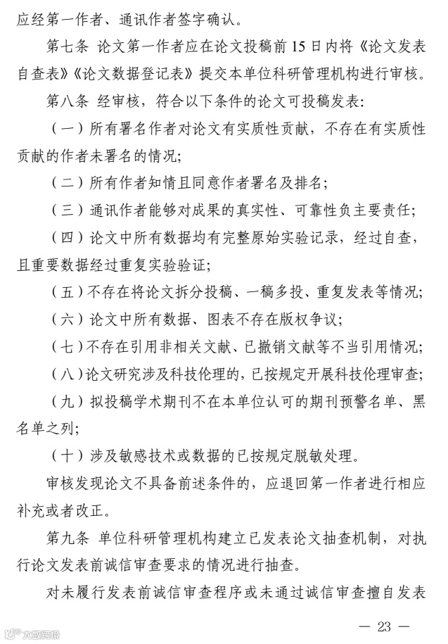 其中《示范文本》“第一部分第三节 科研成果发表管理第三十条”中 明确提出:科研人员应在论文等科研成果发表前开展自查,重点检查作者等成果完成人的实质性贡献及排名顺序、数据可靠性、科技伦理审查情况等,并签署科研诚信承诺书。对短期内发表多篇论文、取得多项专利等成果的,明显不符合科研产出规律的,科研管理机构应组织开展实证核验。