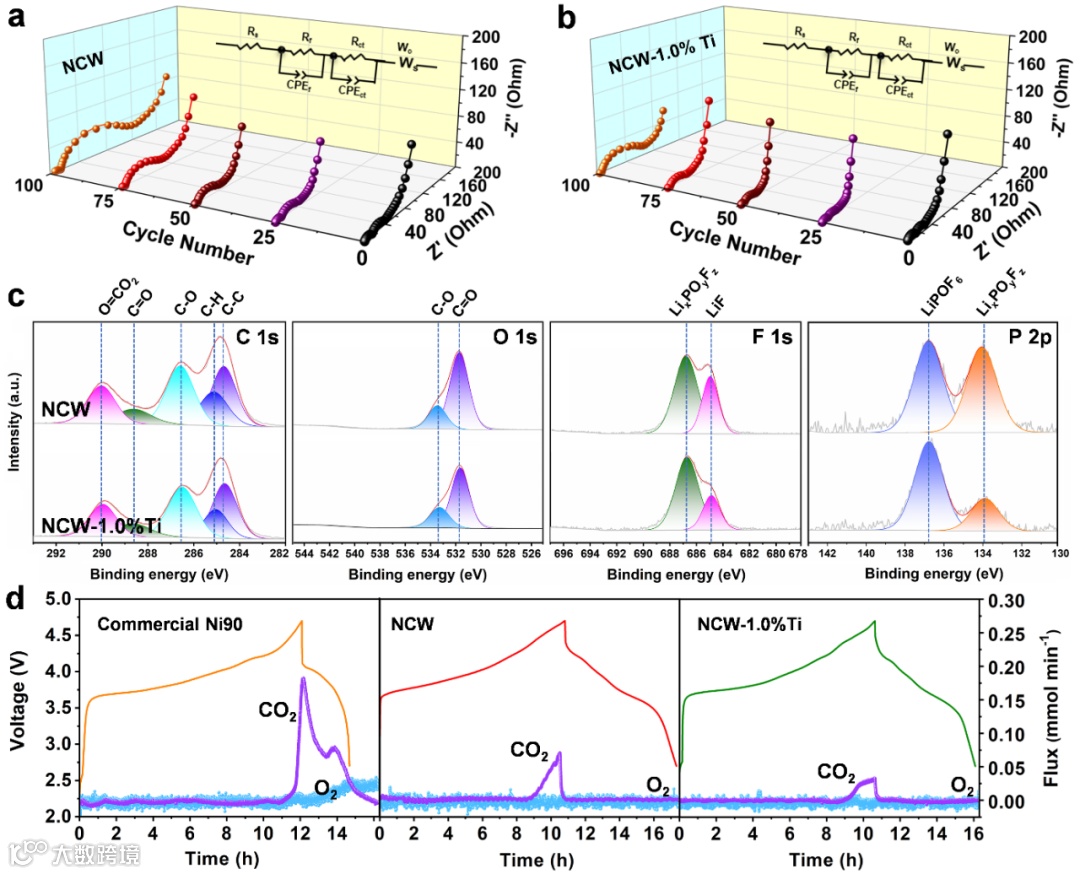 图6 电化学阻抗谱(EIS)、有害副反应和气体析出的对比。(a, b) NCW和NCW-1.0% Ti正极材料在1C下每25次循环后阻抗的奈奎斯特图。(c) NCW和NCW-1.0% Ti正极材料在1C循环100次后的C 1s、O 1s、F 1s和P 2p的XPS谱图和拟合结果。(d) NCMn90、NCW和NCW-1.0% Ti正极材料在2.7-4.7 V的电压范围内0.1C电流密度下首次充放电曲线和相应的原位DEMS测试结果(O2, CO2释放情况)。