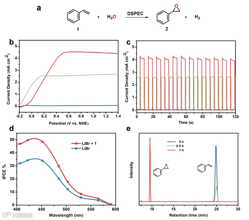 图 2 (a) 光电催化环氧化反应方程式;(b) 光阳极线性伏安曲线;(c) 0.6 V vs NHE电压下,在含有0.1 M LiBr 的CH3CN/H2O中加入(红)和未加入(绿)烯烃1(10 mM)的光电流密度-时间曲线,含0.1 M NH4PF6 的 CH3CN/H2O溶剂中的测试显示为蓝线。(d) 0.6 V vs NHE电压下,TiO2-RuP 在不同波长下的IPCE图。(e) PEC反应过程中在不同时间段所获得的HPLC图。