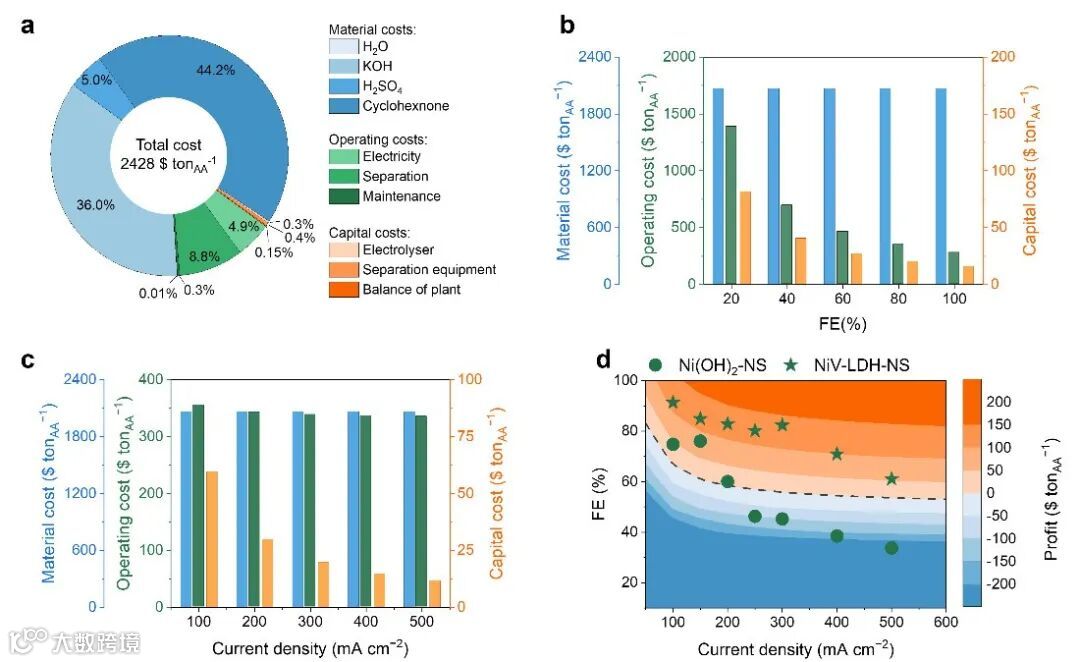 对于MEA中己二酸电合成的工艺路线,采用TEA评估可行性。结果表明,当法拉第效率低于60%时,无论电流密度多大,都不会实现生产盈利;而当法拉第效率高于80%时,当电流密度超过50 mA cm-2时,即可实现盈利。该结果暗示提高法拉第效率对于提升该反应工艺路线经济性的重要性。由于析氧反应的竞争,Ni(OH)2-NS在工业电流密度下难以实现盈利,而NiV-LDH-NS凭借较高的己二酸法拉第效率,可在较宽的电流范围内实现盈利。