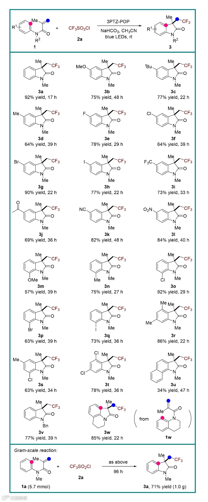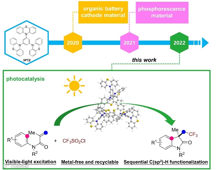 1,3,5-三吩噻嗪基苯(3PTZ)已被应用于有机电池正极材料和室温磷光材料,均展现出优异的性能。本文作者基于3PTZ模块独特的氧化还原能力和光响应特点,将其交联成有机聚合物3PTZ-POP;并将其成功应用于N-芳基丙烯酰胺类底物的环化三氟甲基化反应。