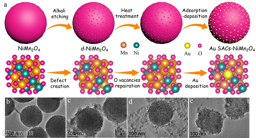 1. 合成了Au SACs-NiMn2O4尖晶石协同复合材料,成功识别了Au的存在状态,即单原子Au占据NiMn2O4的Ni2+空位。