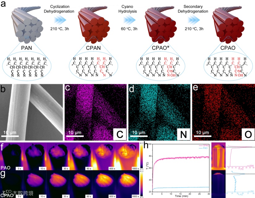 图2 CPAO的光热性能:如图2a所示,PAN在氮气氛中脱氢形成环,然后在碱性条件下氰基水解成偕胺肟基团。CPAO在阳光强度下5分钟内可达到78.5 ℃的恒温,与PAO相比升高了52.1 ℃。
