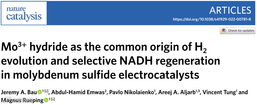 Jeremy A. Bau, Abdul-Hamid Emwas, Pavlo Nikolaienko, Areej A. Aljarb, Vincent Tung, Magnus Rueping. Mo3+ hydride as the commonorigin of H2 evolution and selective NADH regeneration in molybdenum sulfide electrocatalysts. Nature Catalysis. 2022. DOI: 10.1038/s41929-022-00781-8.