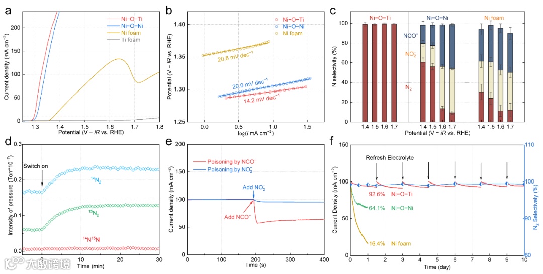 图3 非对称性Ni–O–Ti位点电化学尿素氧化(a) LSV, (b) Tafel斜率, (c)含氮产物选择性, (d)同位素在线质谱,(e) i-t曲线和(f)稳定性测试。
