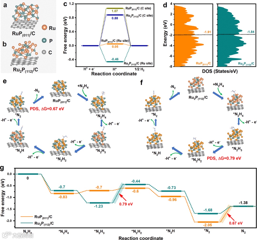 最后,通过DFT理论计算揭示了RuP活性相比Ru2P具有更高的本征催化活性(图6)。根据不同反应位点的HER自由能曲线图,可以发现氢在金属Ru上的吸附是更有利的;相比较于Ru2P相,RuP的氢结合能(∆GH*)更接近于热中性,同时,RuP的d带中心也更偏离于费米能级,说明RuP可以减弱对H*的吸附作用,有利于H的脱附,这些结果都进一步说明RuP上的HER过程更加有利。对于HzOR,水合肼在RuP(0.67 eV)上脱氢决速步能垒明显低于Ru2P(0.79 eV),从而促进了HzOR反应动力学。所以,从实验和理论上都证明了相选择合成的RuP/C-PAN样品具有更高的双功能活性。