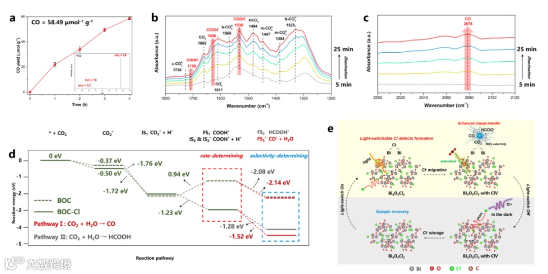 图4 CO生成量,插入图片为光催化还原13CO2过程中13CO2的同位素标记实验结果(a);原位红外测试CO2光催化还原过程(b,c);基于DFT计算,CO2在BOC和BOC-Cl上的光催化还原反应路径(d);光开关动态Cl空位促进100%将CO2光催化还原为CO的机理(e)。